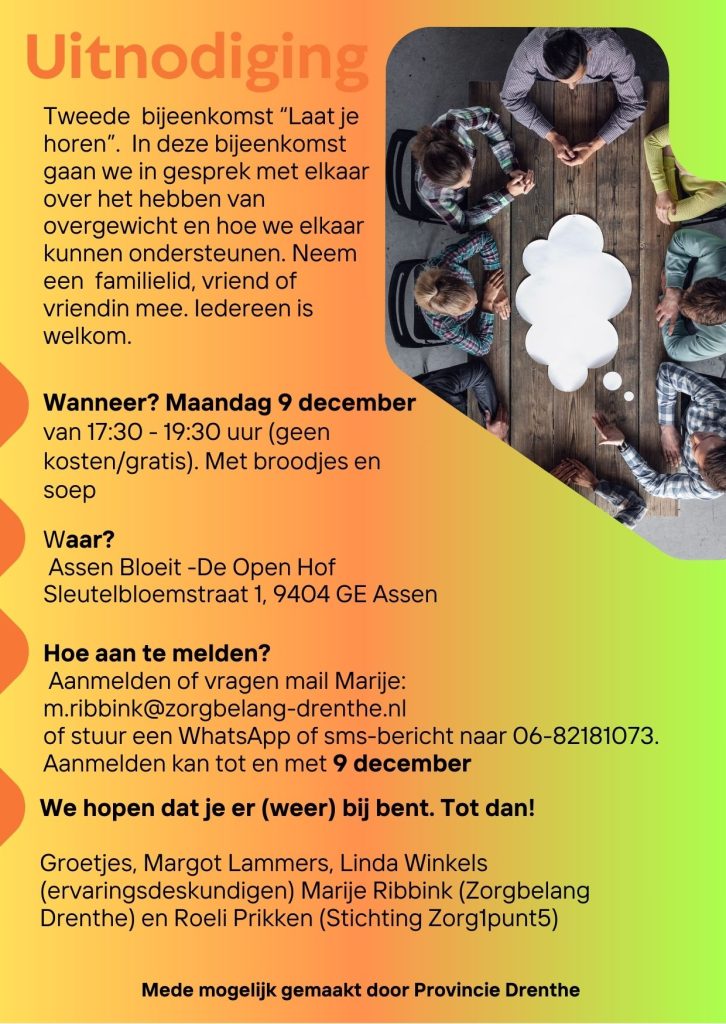 Uitnodiging: Lotgenotenbijeenkomst 2 december 2024 van CLeZ In deze tweede bijeenkomst gaan we in sprek met elkaar over het hebben van overgewichten hoe we elkaar kunnen steunen. Maandag 9 december 2024Locatie: De Open Hof, Sleutelbloemstraat 1, 9404 GE Assen.
